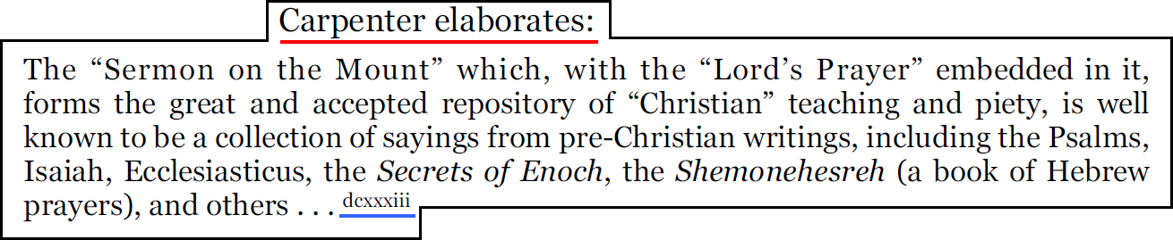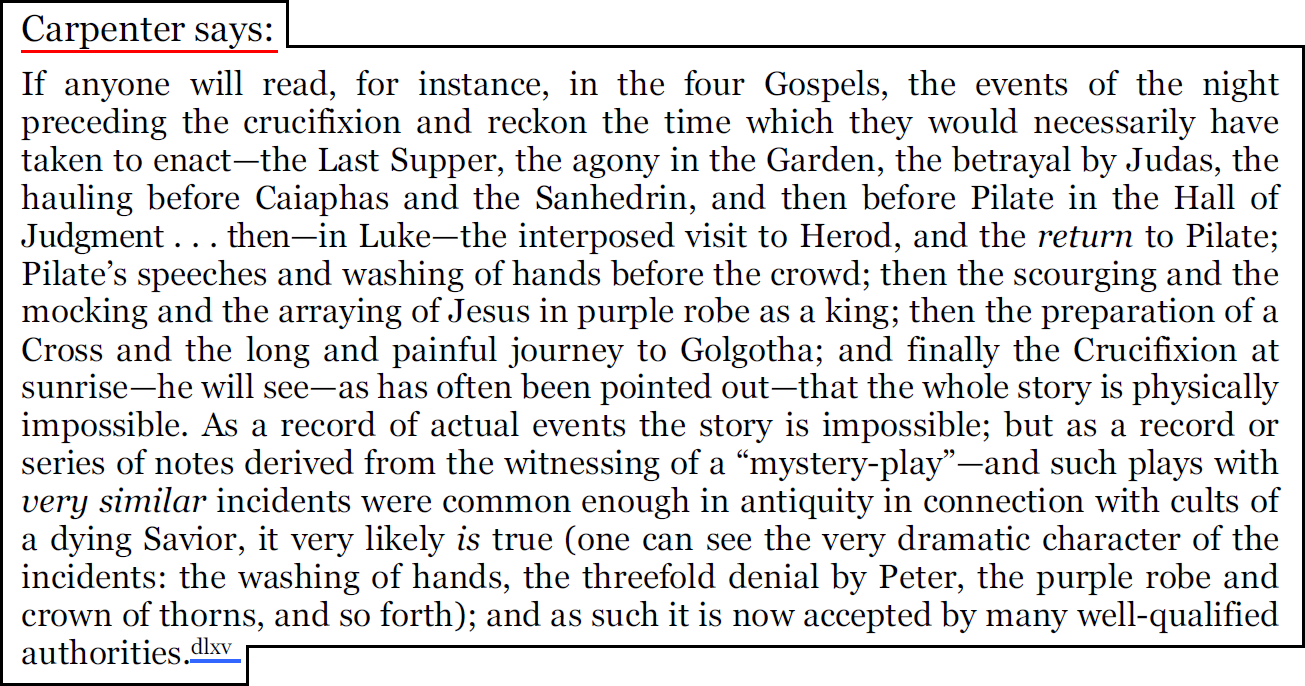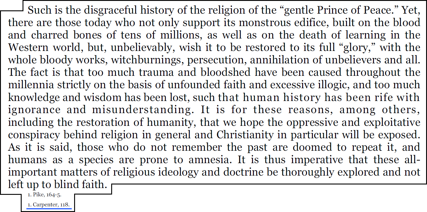 Le livre "The Christ Conspiracy" d'Acharya, qui est une source principale de Zeitgeist, contient 20 citations du livre d'Edward Carpenter, intitulé "Pagan and Christian Creeds".