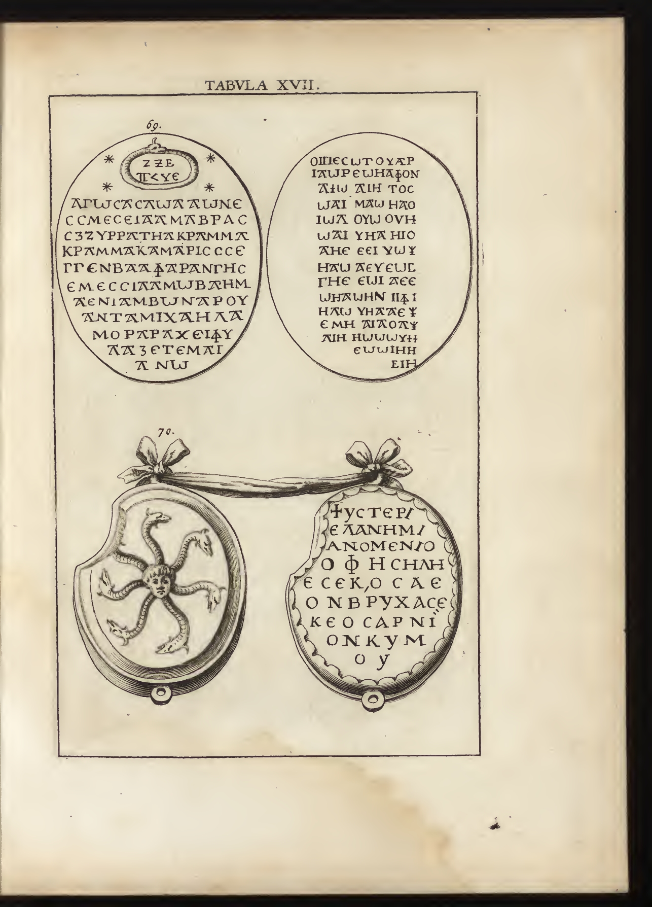 ➜ Il s'agit de l'illustration numéro 69 (figure LXIX) contenue dans le tableau n°17, situé entre les pages 48 et 49, du livre de Jean Chifflet (loannes Chifletius) datant de 1657, intitulé : Ioannis Macarii canonici ariensis Abraxas