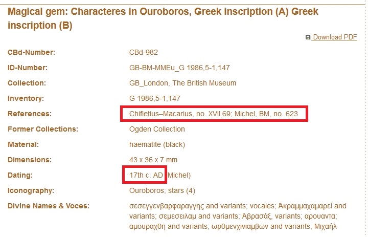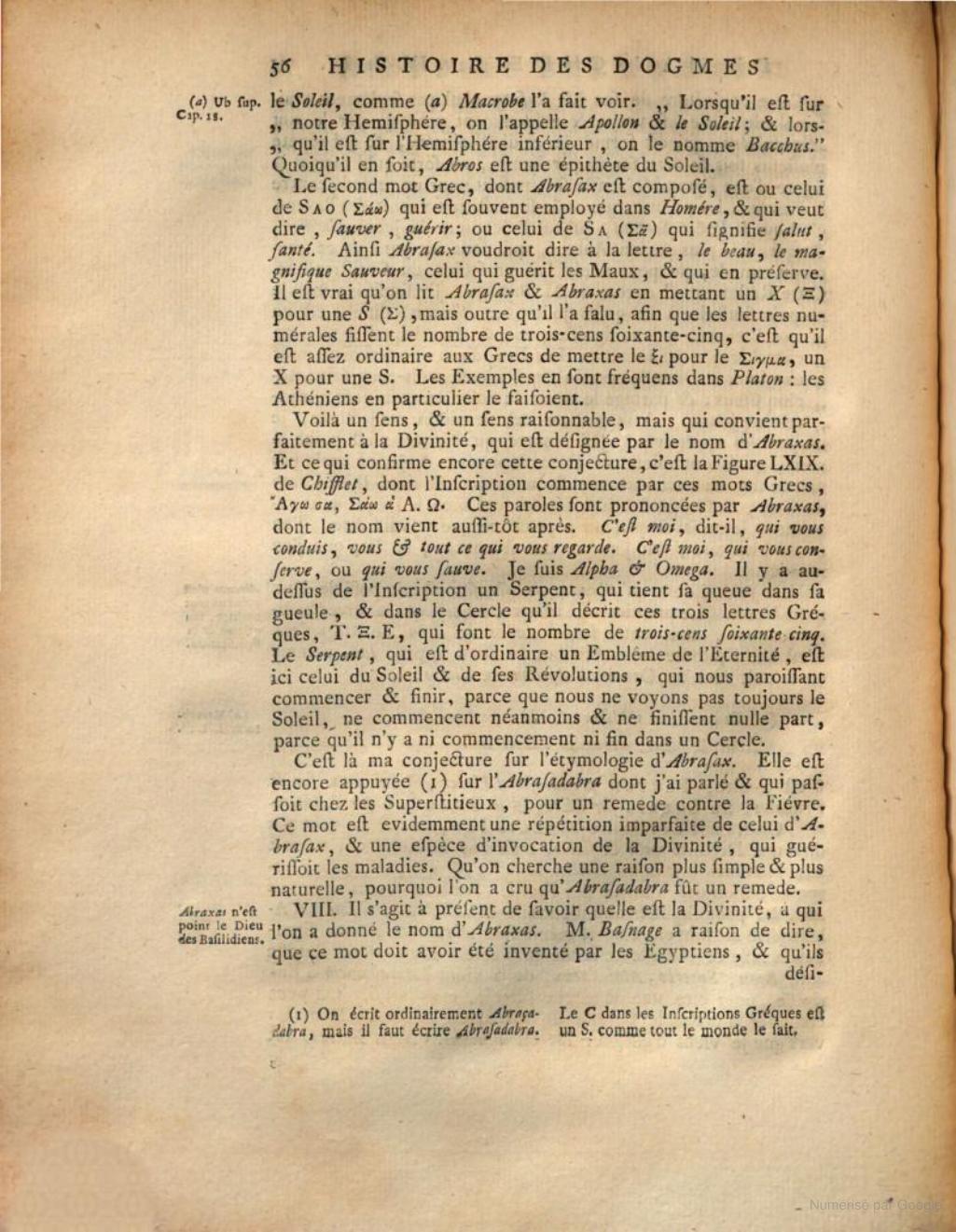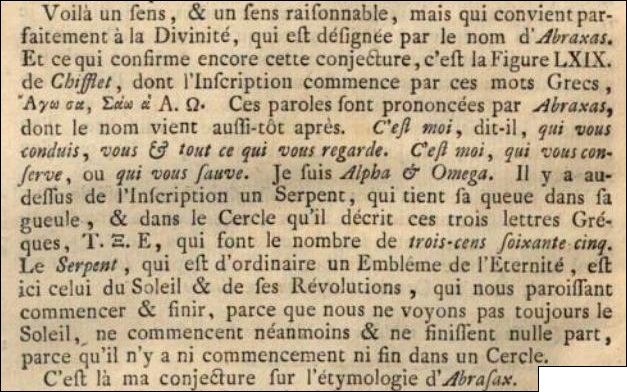 ➜ Le contexte de cette citation c'est l'éthymologie du mot « Abraxas », où la figure LXIX de Chifflet est cité pour son évocation à ce sujet.