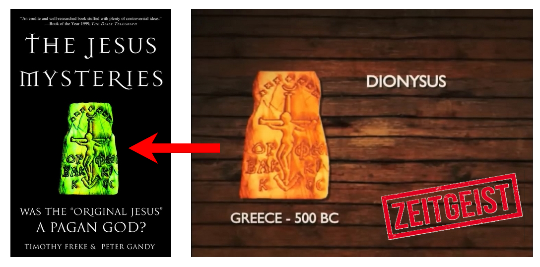 Il est très probable que Zeitgeist recycle ici une image popularisée par des ouvrages mythistes (notamment Freke & Gandy, The Jesus Mysteries, 1999, qui l’emploient en visuel), mais dans tous les cas la conclusion ne change pas : un objet postérieur au christianisme ne peut pas démontrer que le christianisme aurait “copié” une crucifixion païenne antérieure.