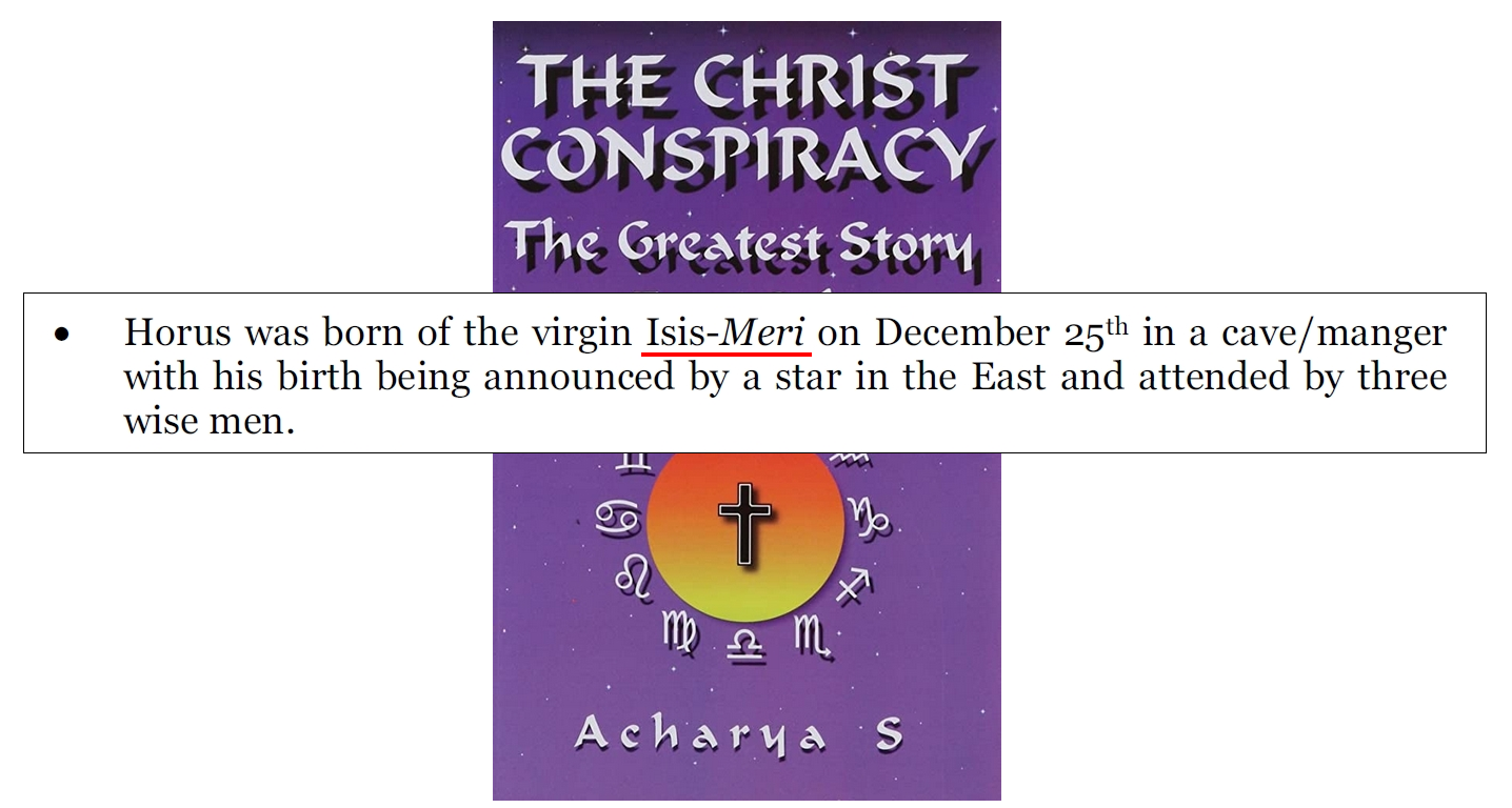 Cette manière malhonnêtement de procéder confirme que Peter Joseph utilise une stratégie argumentative propre à la thèse mythiste. D’ailleurs, l’affirmation selon laquelle Horus serait né de la « vierge Isis-Meri » se retrouve déjà chez Acharya S (D. M. Murdock) dans The Christ Conspiracy (à la page 84), et Zeitgeist s’inscrit dans une lignée de sources qui reprennent ce type de formulation.