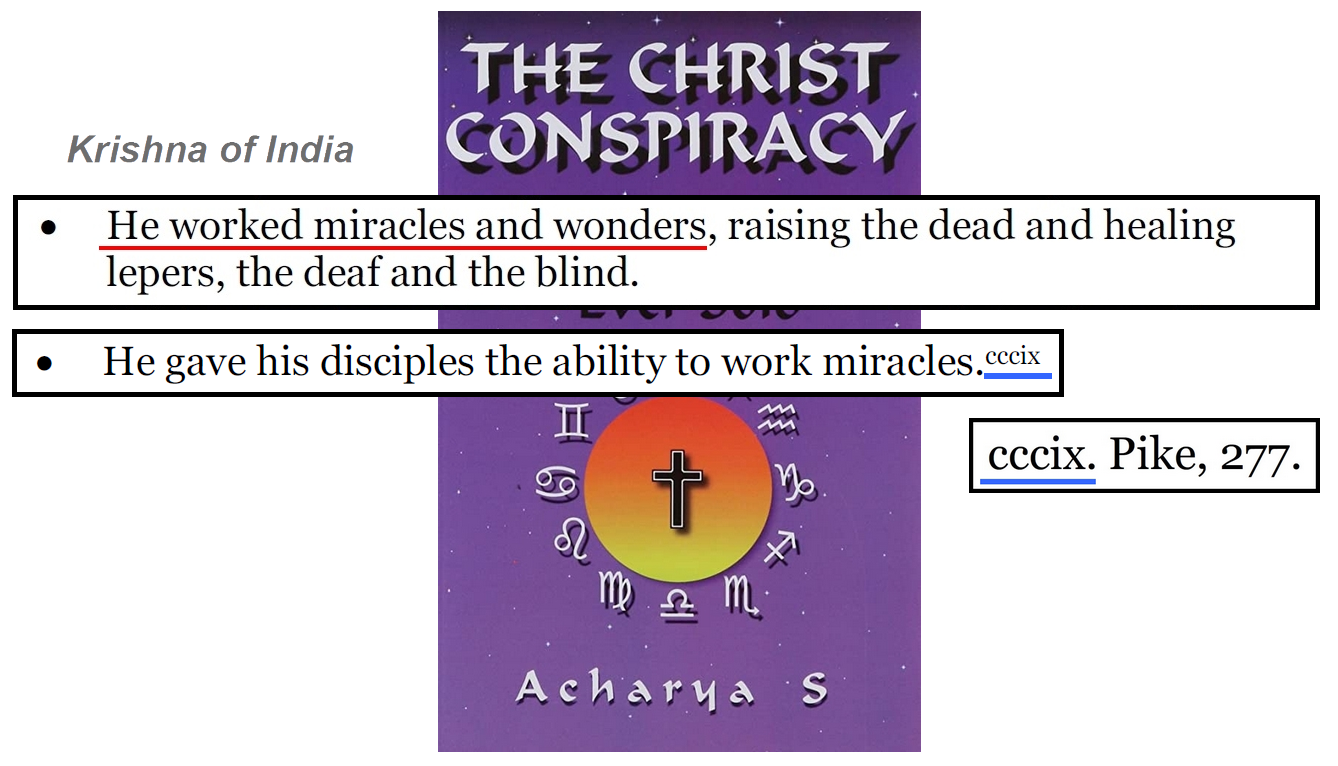 L'enseignement de Zeitgeist au sujet des miracles de Krishna et de ses disciples, a pour origine ce livre d'Albert Pike. Les deux citations soulignées en rouge. Et pile au milieu en bleu, on a la référence manquante qu'Acharya S avait malencontreusement perdue (Voir ici).
