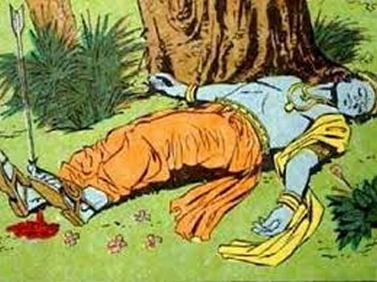 Dans les récits classiques, la fin terrestre de Krishna est liée à une flèche tirée par le chasseur Jâra/Jara, qui le prend pour un cerf et le blesse au talon / au pied : c’est ce que raconte explicitement le Mahābhārata (Mausala Parva), où Jara “le perce au talon” d’un trait après l’avoir confondu avec un cerf. (sacred-texts.com)