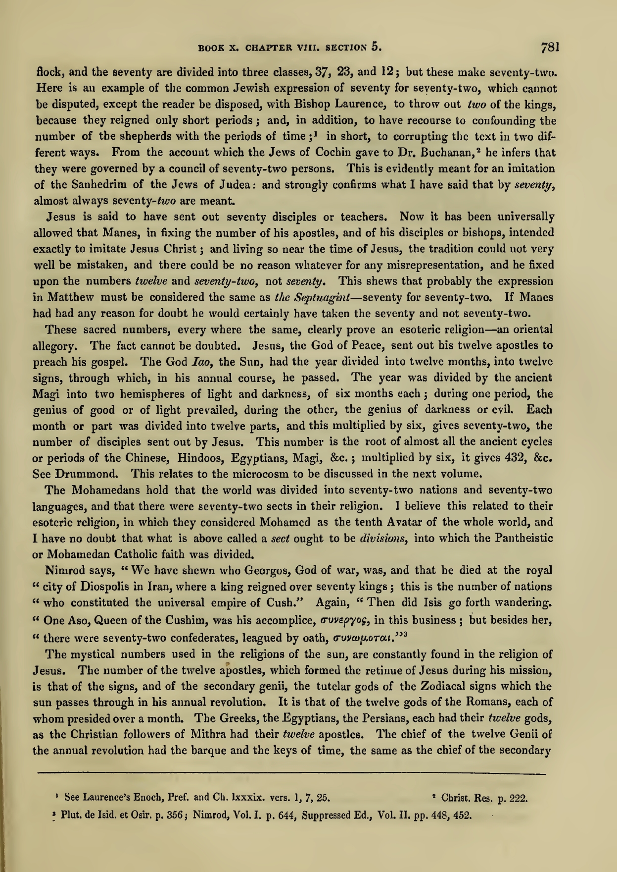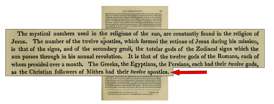 Aucune note ou référence n'est donnée en bas de page. Il s'agit juste de l'allégation de ce franc-maçon, qui rappelons-le, a été cité 94 fois par la source principale de Zeitgeist. On avait vu ailleurs que le cercle mythiste était notamment composé de francs-maçons et de théosophes, ils sont à l'origine de cette thèse mythiste. On le voit encore ici, puisque les écrits de Godfrey Higgins (en particulier Anacalypsis) ont eu plus tard une influence majeure sur le développement de la théosophie, à travers les publications d'Helena Blavatsky. (Source : Theosophical History vol 1 no 3 July 1985)
